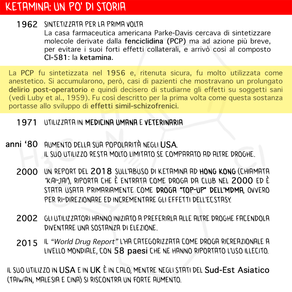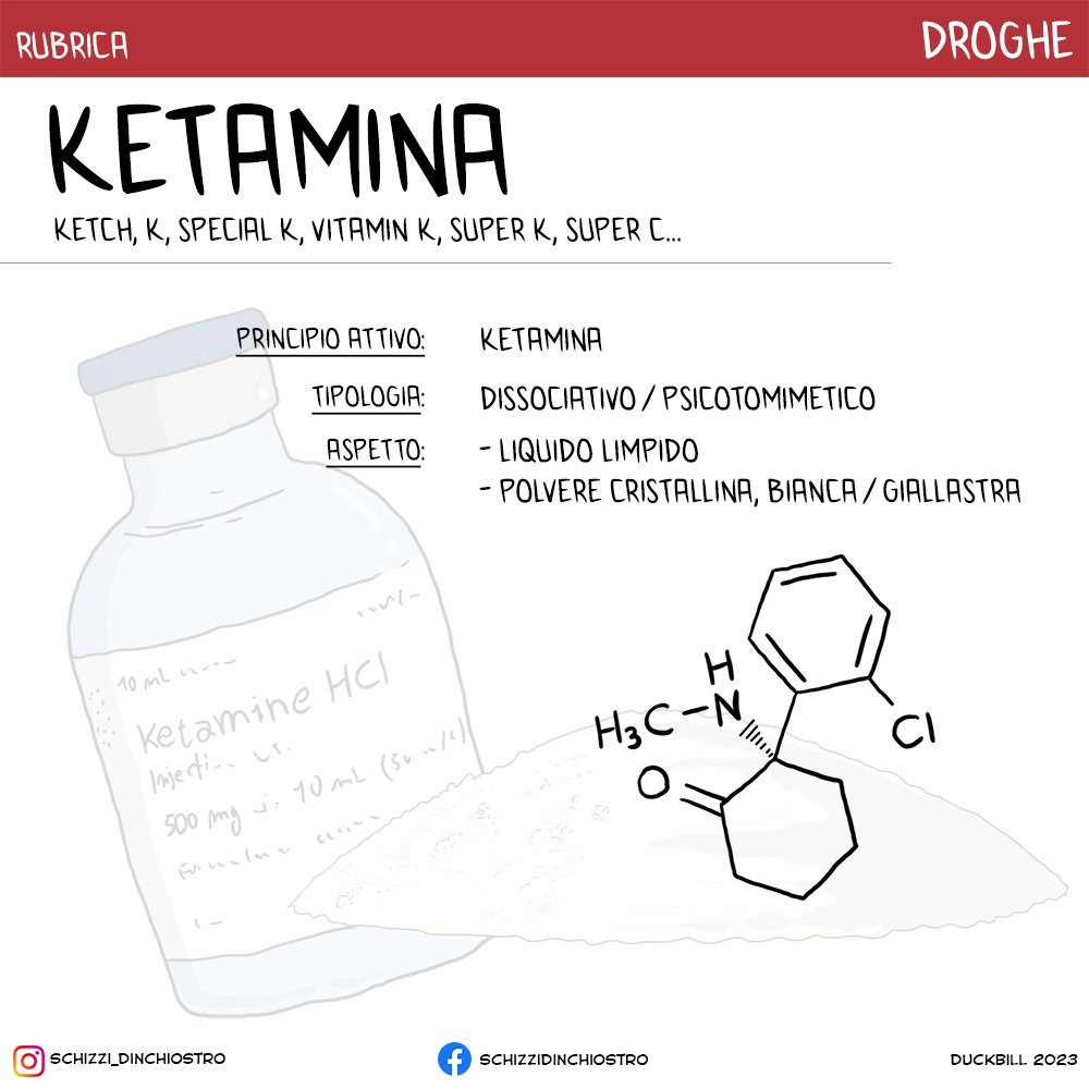 La ketamina è un derivato della fenciclidina (PCP) ed è stata sintetizzata per la prima volta negli USA nel 1962. Utilizzata in medicina umana e veterinaria dal 1971, non solo per le sue azioni anestetiche ma anche per curare depressione e disordine bipolare. Le sue forti proprietà psicostimolanti e la facilità di assorbimento l’hanno ovviamente fatta riscoprire subito come sostanza d’abuso.