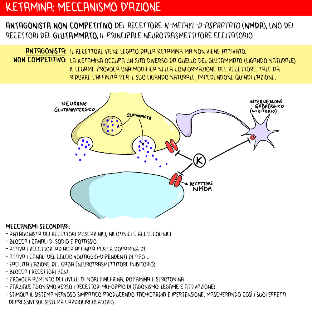 La ketamina è un antagonista non competitivo del recettore N-methyl-D-aspratato (NMDA), uno dei recettori del glutammato. Forse questo vi dice poco ma sappiate che il glutammato è un neurotrasmettitore e, in particolare, di tipo eccitatorio. La ketamina, quindi, lega il recettore NMDA del glutammato tramite un’azione antagonista. Cosa significa? Il termine “antagonista” si riferisce al fatto che il recettore viene legato dalla ketamina ma NON viene attivato. La sostanza occupa però un sito diverso da quello del glutammato (non competitivo) ma il legame provoca una modificazione nella conformazione dal recettore, tale da ridurre l’affinità per il suo ligando naturale, impedendone quindi l’azione. Questa è una spiegazione molto semplificata ma vi dovrebbe rendere più intuitiva la sua azione.