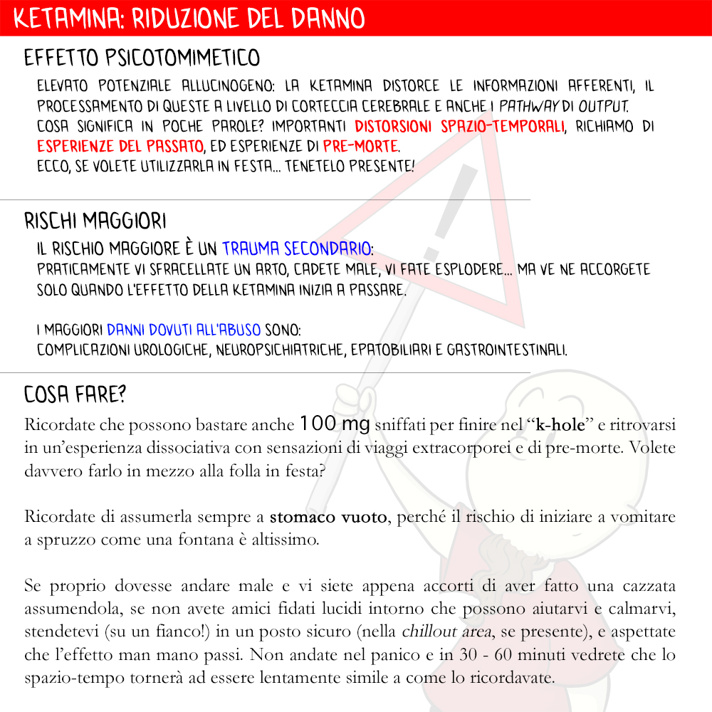 Ricordate che, se la sostanza è pura, possono bastare anche 100 mg inalati per finire in pieno “k-hole” e ritrovarsi in un’esperienza dissociativa con sensazioni di viaggi extracorporei e di pre-morte. Se questo dovesse accadere, magari per la prima volta, in mezzo ad una folla, non penso debba essere una bella sensazione. Poi sono sempre gusti, eh. C’è di peggio. C’è chi ascolta Gigi D’Alessio nel mondo, ricordiamolo.