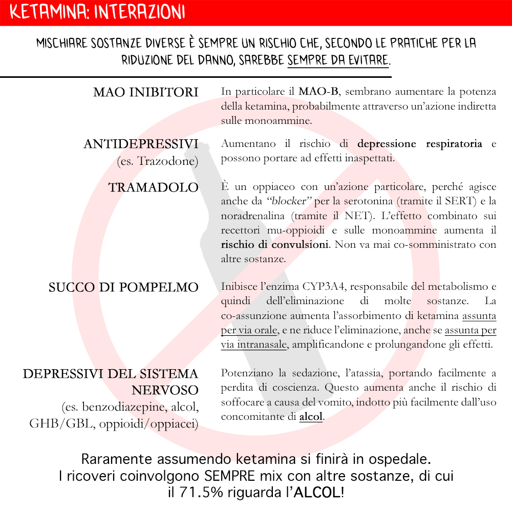– la caffeina, invece, sembra essere introdotta intenzionalmente per combattere il k-hole e portare chi utilizza ketamina ad un maggiore stato di allerta e, conseguentemente, a consumarne maggiore quantità.