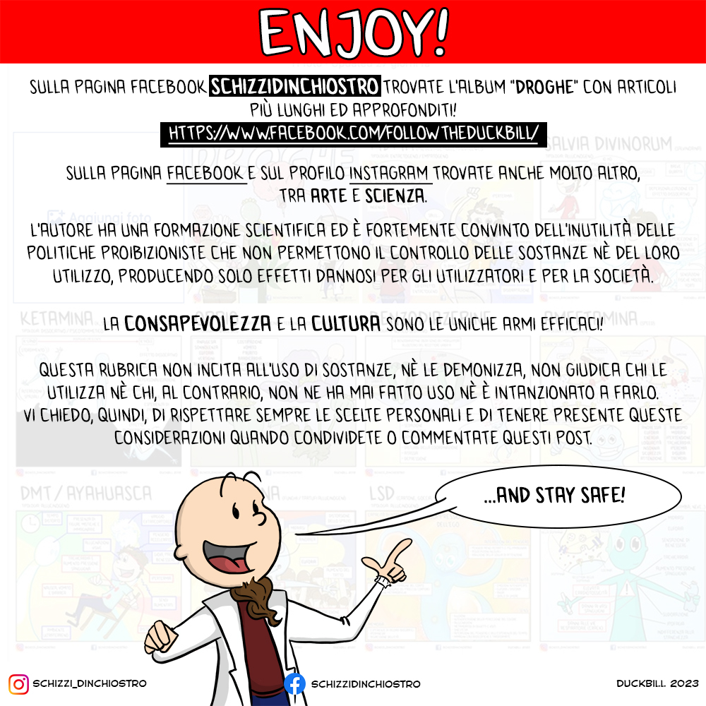 Se proprio dovesse andare male e vi siete appena accorti di aver fatto una cazzata assumendola, se non avete amici fidati lucidi intorno che possono aiutarvi e calmarvi, stendetevi da qualche parte in un posto sicuro, e aspettate che l’effetto man mano passi. Non andate nel panico e in 30 minuti vedrete che il mondo tornerà ad essere simile a come lo ricordavate e il tempo ad avere la stessa velocità di prima. E stendetevi sempre su un fianco. Infatti, se proprio volete assumerla, ricordate di farlo sempre a stomaco vuoto, perché il rischio di iniziare a vomitare a spruzzo come una fontana è sempre altissimo. Anche in questo l’alcol peggiora la situazione, eh.