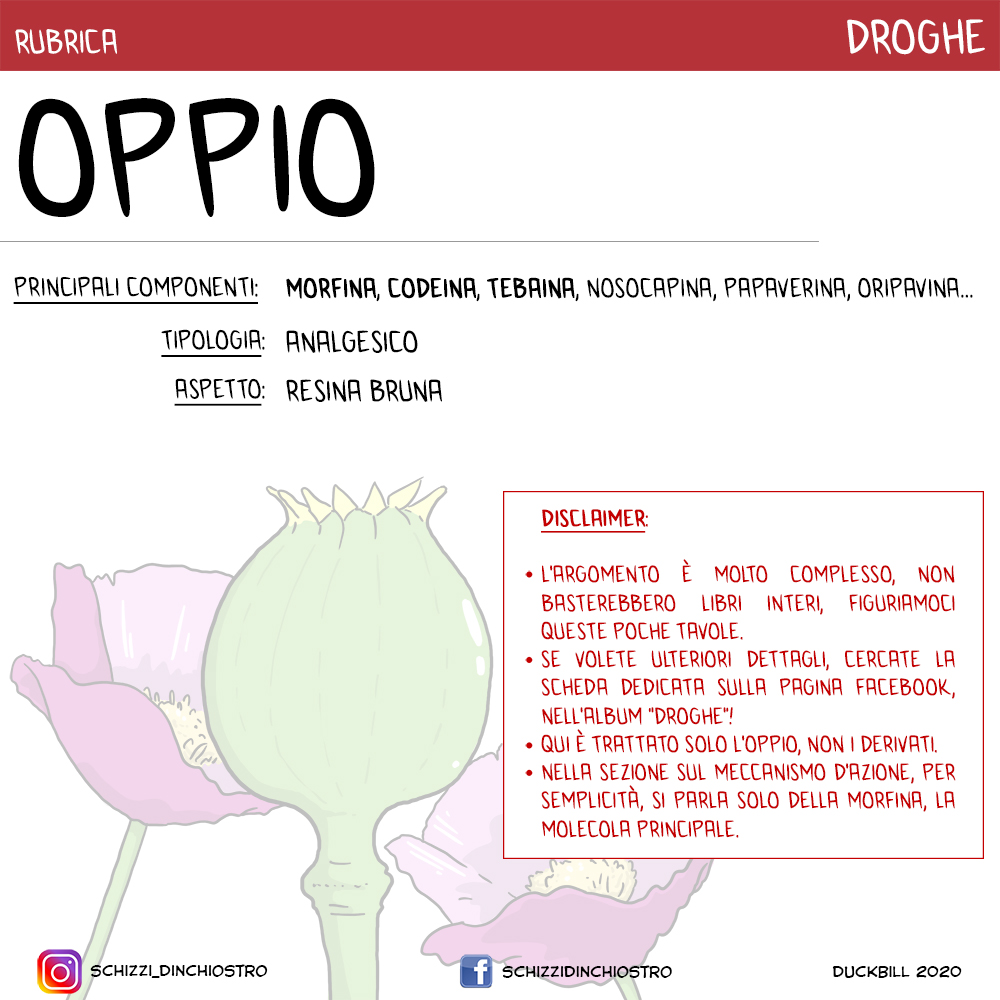 Parlando dell’oppio in quanto tale è difficile discutere il suo meccanismo d’azione dato dal mix delle diverse sostanze contenute nella resina. Esistono, inoltre, tantissimi oppiacei sintetici derivati dalle molecole originali e utilizzati attualmente in clinica (vedi Listos et al., 2019 per l’elenco completo), ma qui ritengo giusto soffermarci sul meccanismo legato al suo componente principale: la morfina.