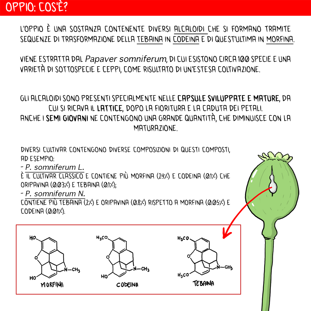 Come descritto in precedenza, l’oppio contiene tante sostanze di cui il 40% sono alcaloidi, e tra cui i più rappresentati sono: morfina (8-17%), nosocapina (1-10%), papaverina (0.5-1%), codeina (0.7-5.0%) e tebaina (0.2%).