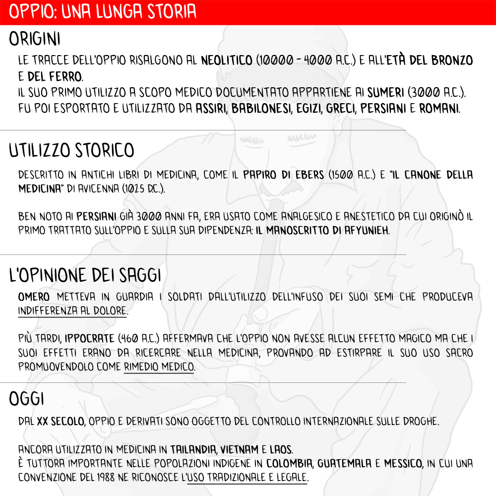 L’utilizzo dell’oppio risale al Neolitico (10000 – 4000 a.C.) e all’età del bronzo e del ferro, mentre il suo primo utilizzo a scopo medico documentato risale ai Sumeri (3000 a.C.). Da qui l’oppio fu poi esportato e utilizzato da Assiri, Babilonesi, Egizi, Greci, Persiani e Romani. I libri di medicina antichi e importanti, come il Papiro di Ebers (1500 a.C.) o “il Canone della Medicina” di Avicenna, descrivono l’uso di questa sostanza.