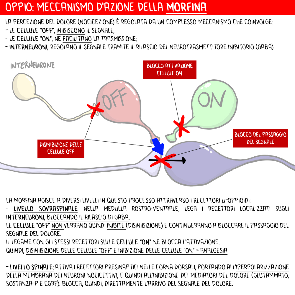 La morfina agisce a diversi livelli in questo processo. A livello sovraspinale, nella medulla rostro-ventrale, lega i recettori µ-oppioidi localizzati proprio sugli interneuroni, bloccando il rilascio di GABA. Le cellule “off” NON verrano quindi inibite (disinibizione) e continueranno a bloccare il passaggio del segnale del dolore. Ma non finisce qui, perché anche le cellule “on” possiedono i recettori µ-oppioidi e il legame con la morfina va a bloccare l’attivazione di queste cellule.