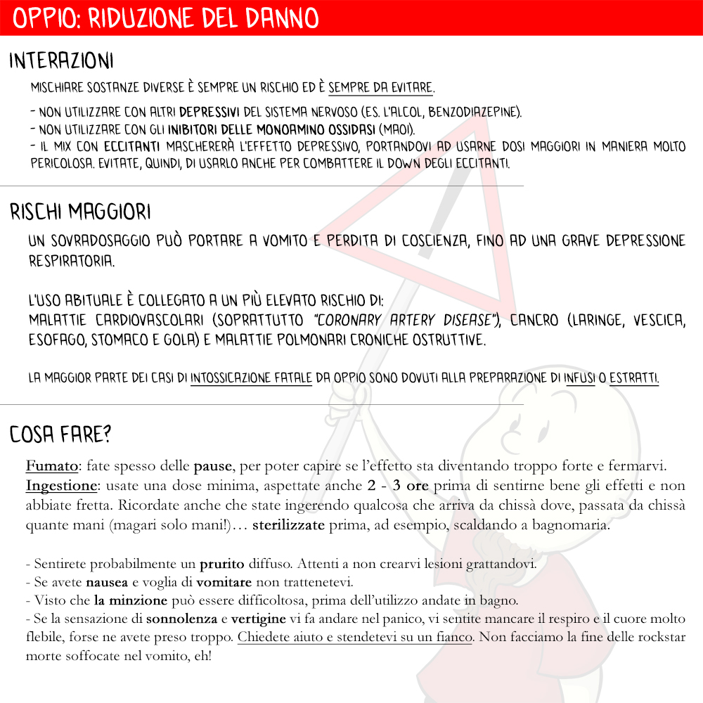 Volete davvero fumare o ingerire oppio? Visti tutti gli effetti collaterali indicati, ricordate di farlo a stomaco vuoto e non mischiate MAI con alcolici e altri depressivi del sistema nervoso e cardio-respiratorio. Attenti a non prenderne troppo, l’intossicazione è dietro l’angolo, anche perché non conoscete la concentrazione di morfina all’interno.